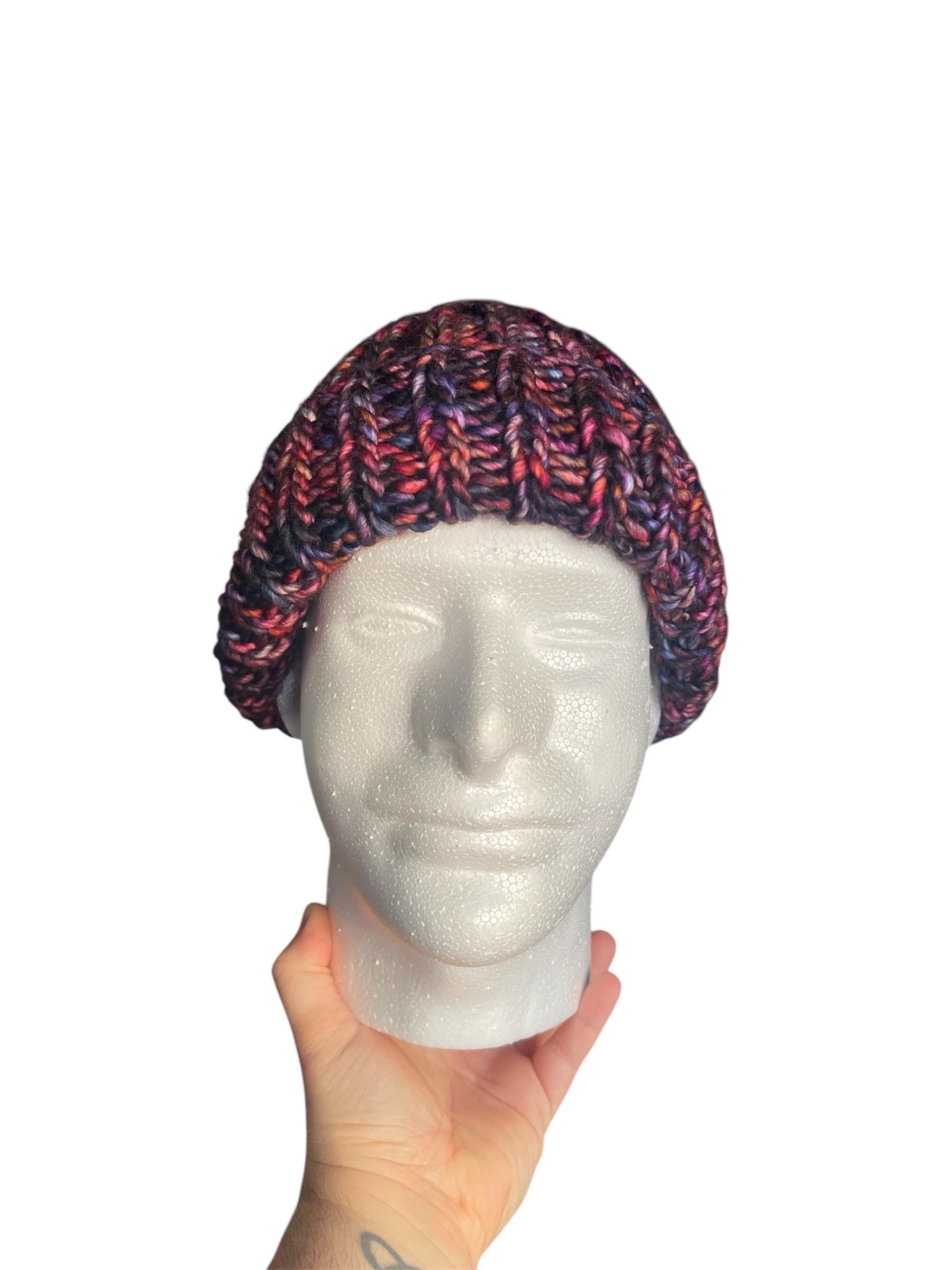 Hand knit chunky wool beanie. Made with hand dyed merino wool. Hand wash in cold, lay flat to dry.
